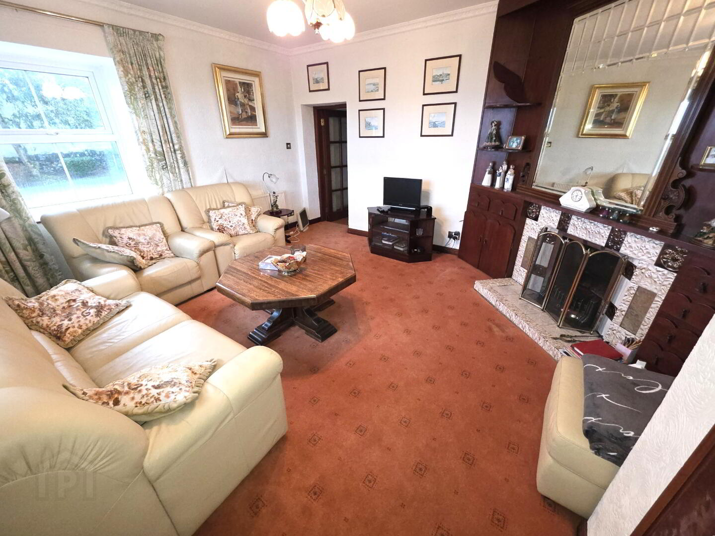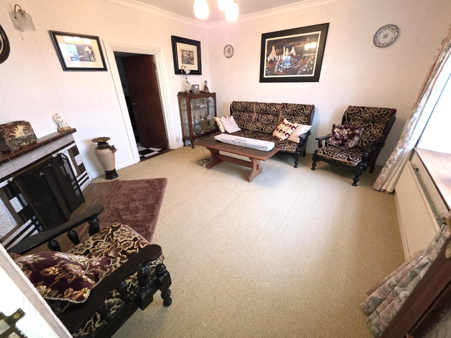 Carpeted, fireplace, 2 windows, 1 radiator, power points, door to