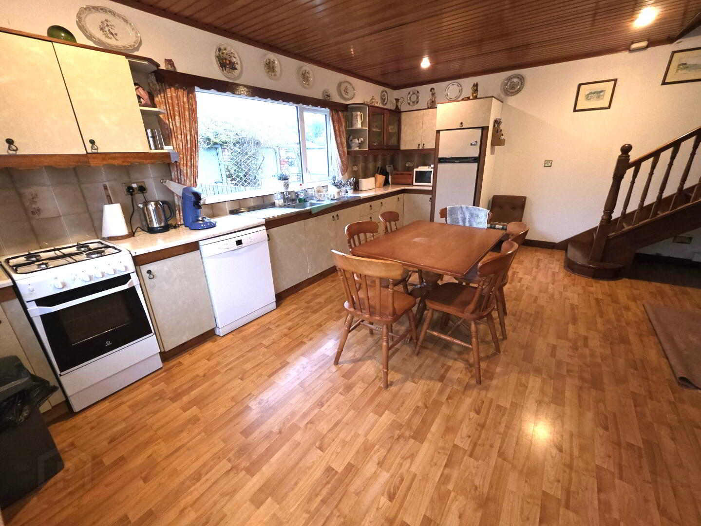 Vinyl flooring, base and eye level units with worktop space over, stainless steel sink, tiled splashbacks, pvc panelled ceiling, space for cooker, dishwasher and fridge freezer, recessed downlighting, 2 windows, 1 radiator, power points, stairs to first floor