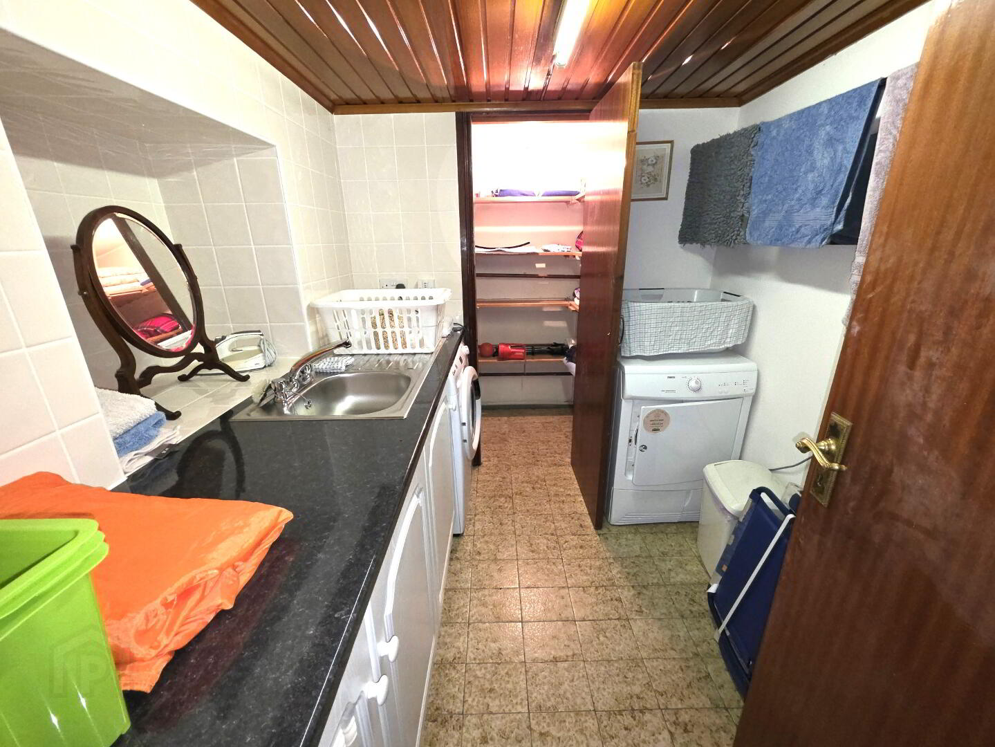 Tiled floor, tiled wall, base unit with worktop space over, stainless steel sink, plumbed for washing machine and space for tumble dryer, hot press off, power points