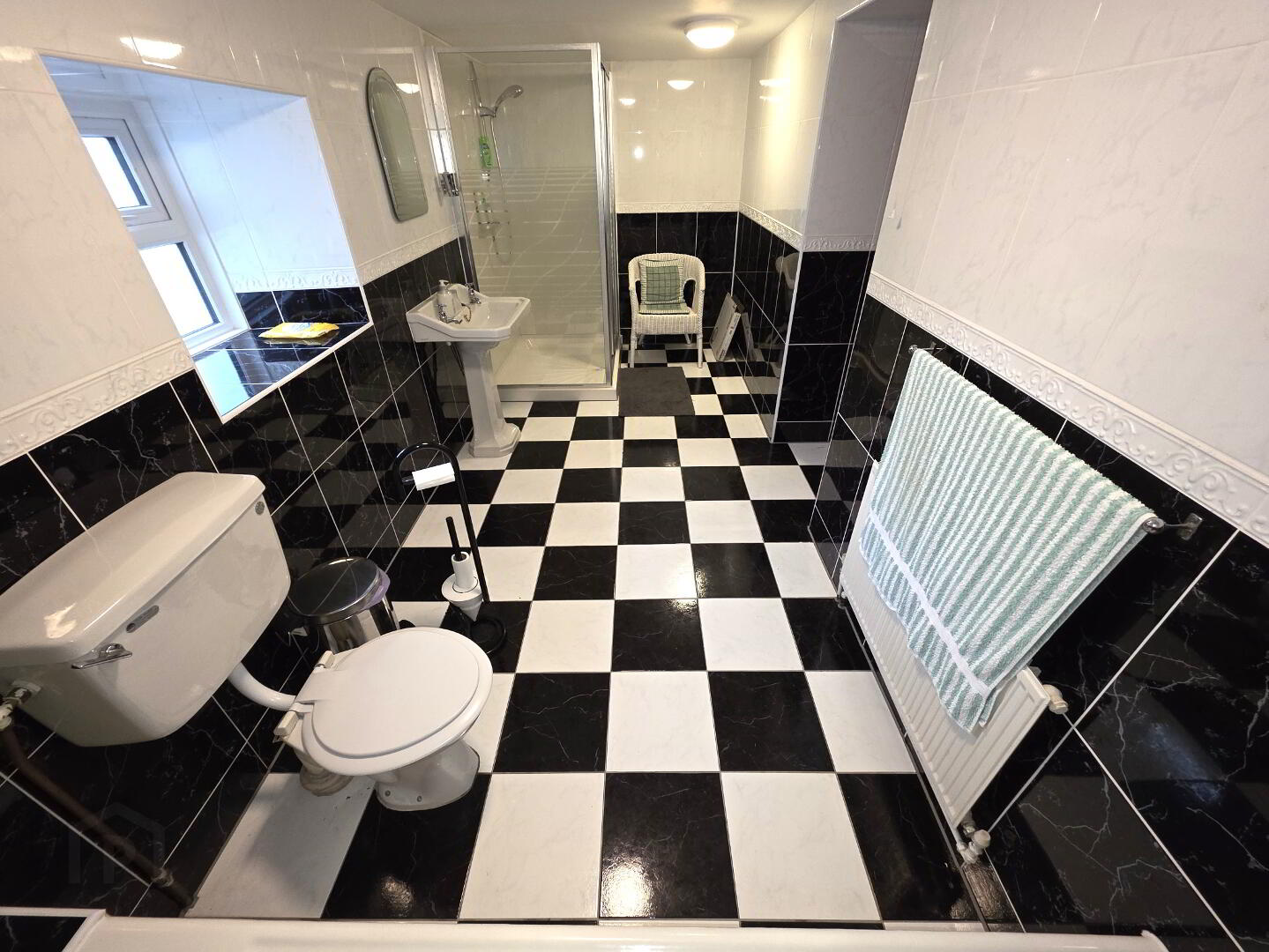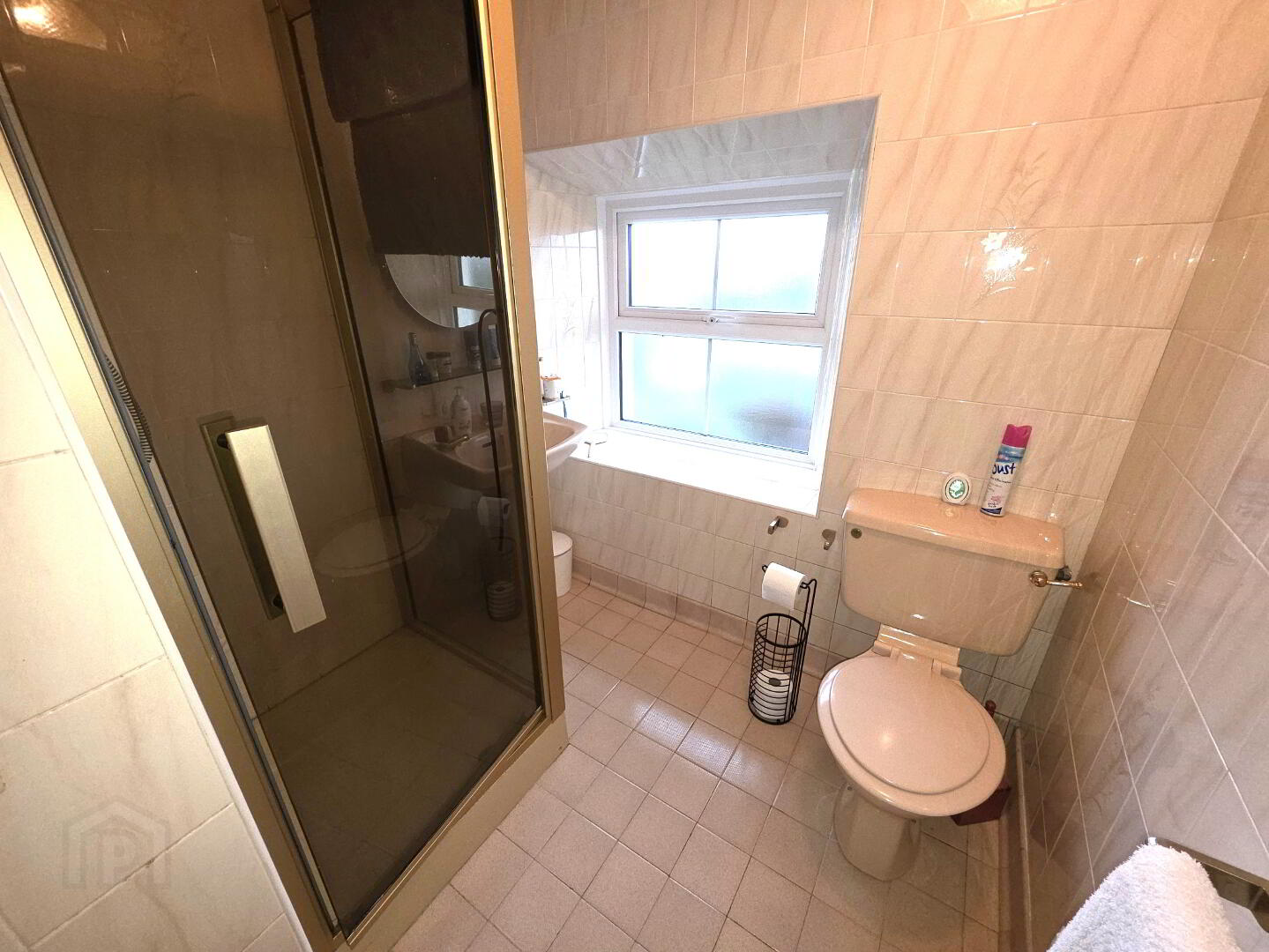 Tiled floor, tiled walls, WC, wash hand basin, shower cubicle with pvc cladding to walls, 1 window, 1 radiator