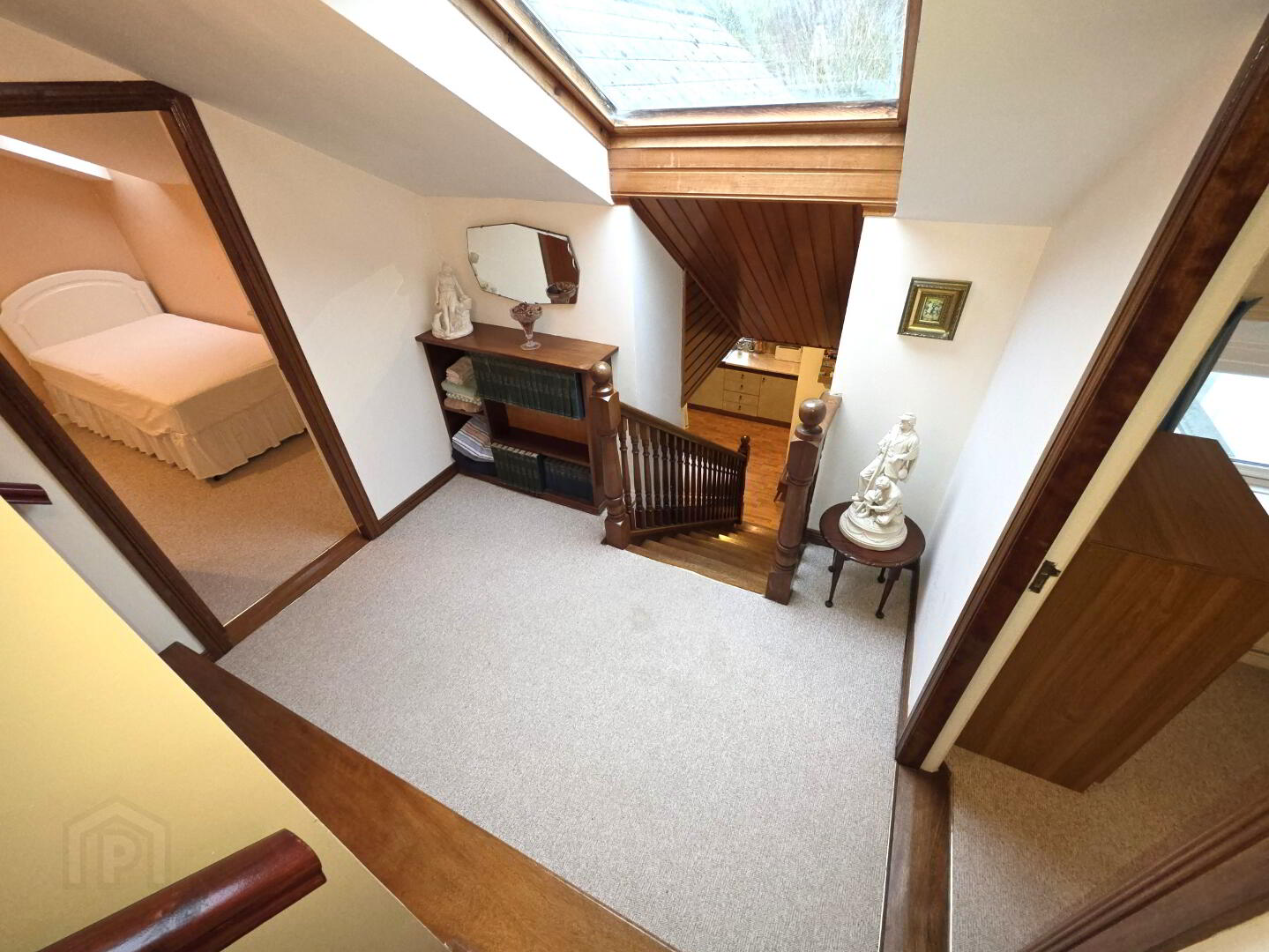 LANDING: Carpeted, Velux style window, steps to: