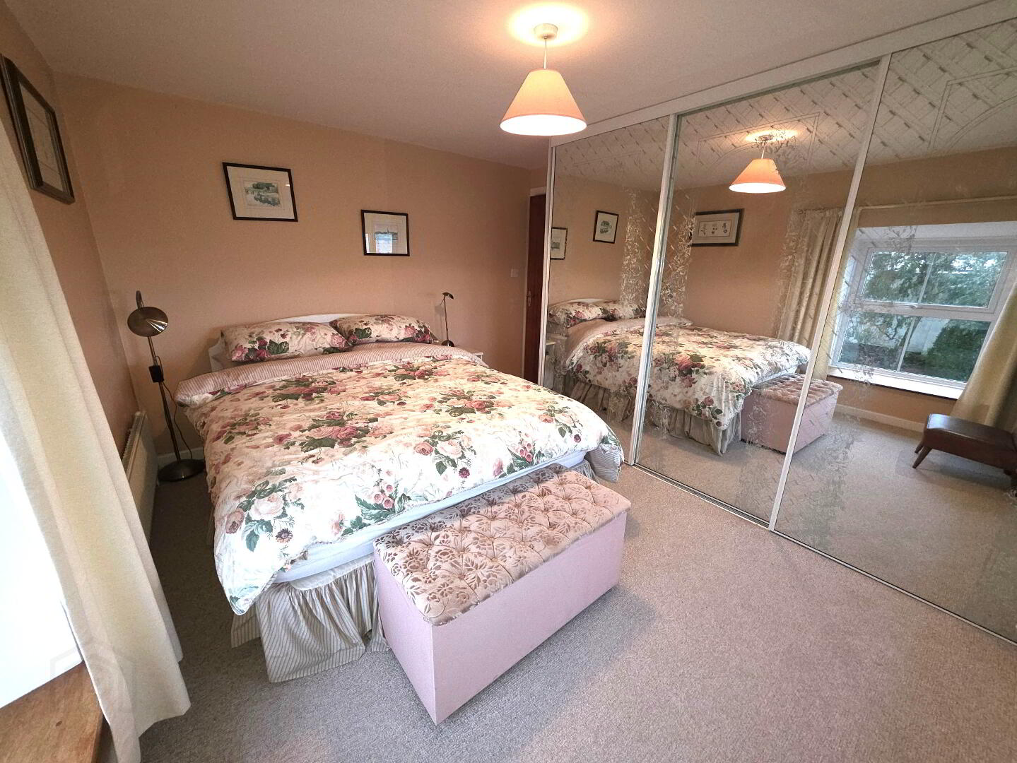 Carpeted, built in wardrobe space with glass fronted doors, 1 window, 1 radiator, power point