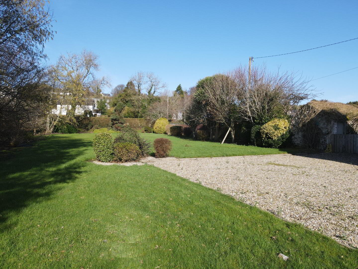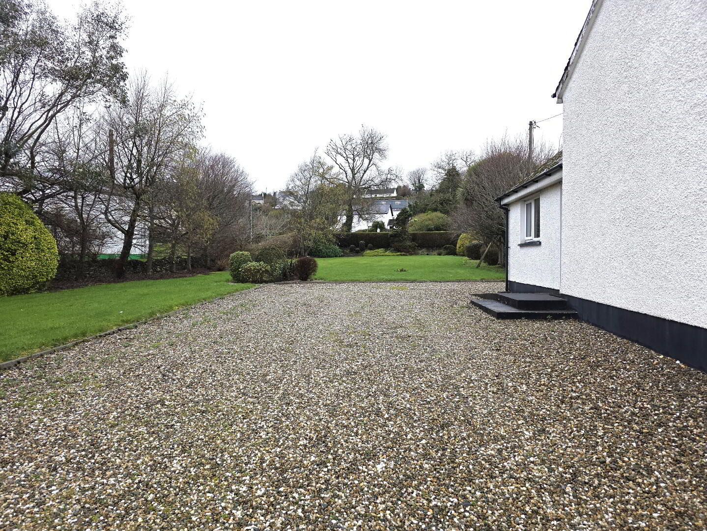 Spacious stone driveway to side for ample car parking, large garden with shed to the side and rear, paved area with mature shrubs to front