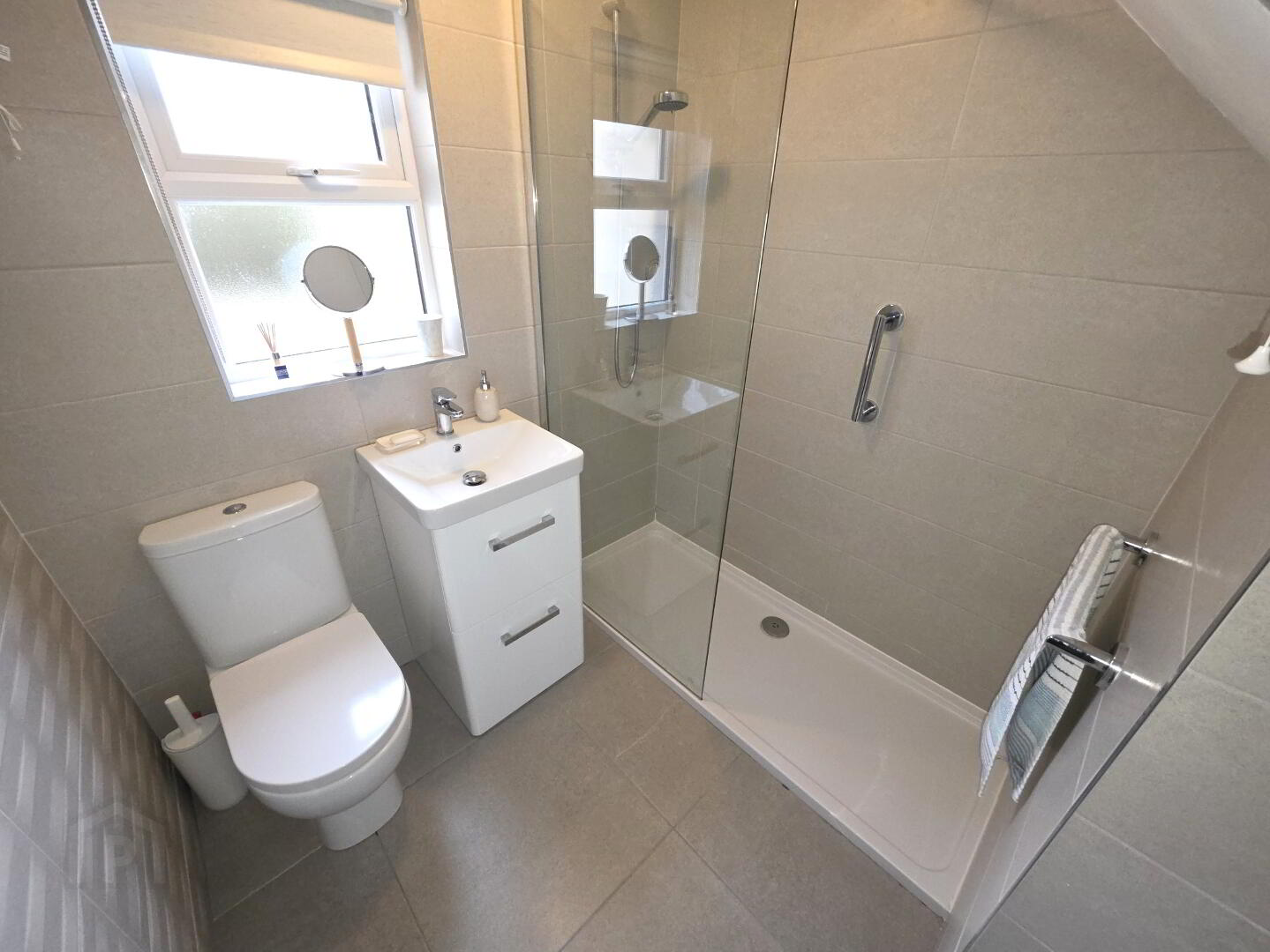 Tiled floor, tiled walls, WC, wash hand basin with vanity unit under, tiled shower area with Aqualisa electric shower unit, 1 window with rolled blind, 1 chrome radiator