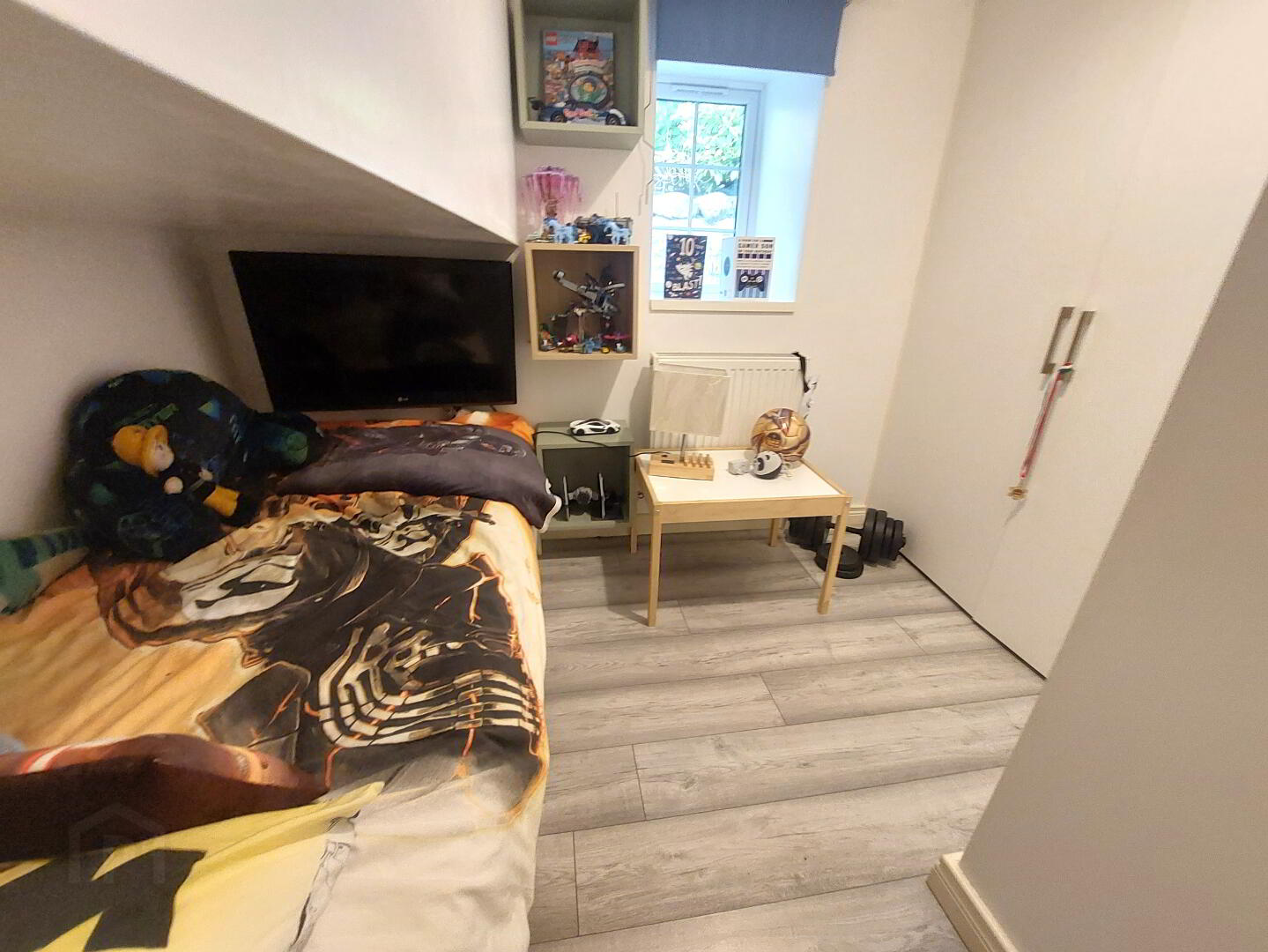 Laminate wooden floor, 1 window with roller blind, 1 Velux window, recessed downlights, power point and telephone point.