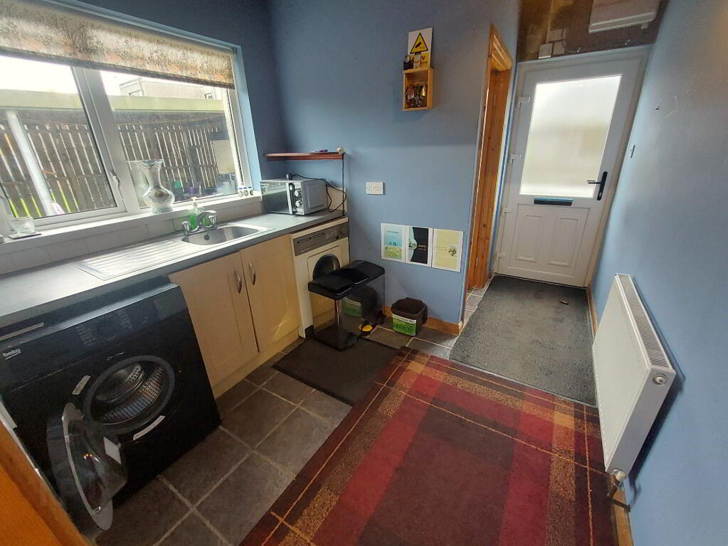 Tiled floor, range of base units with worktop space over, stainless steel sink unit, tiled splashbacks, space for washing machine and tumble dryer, 1 window, 1 radiator, power points, door to side, door to: