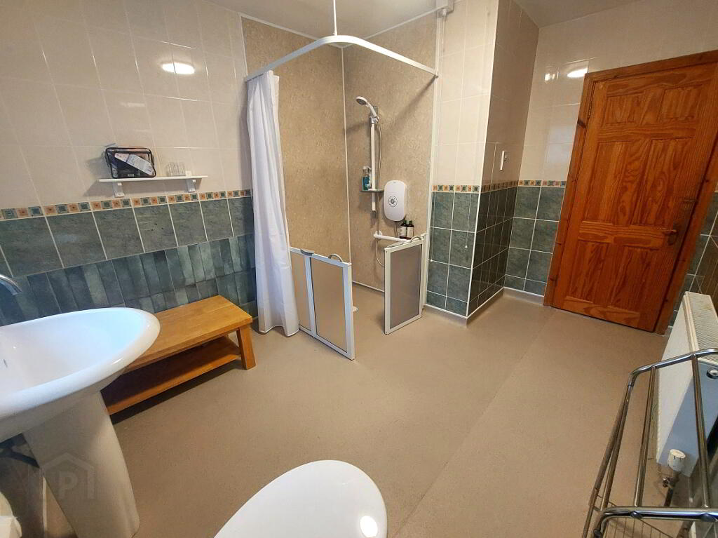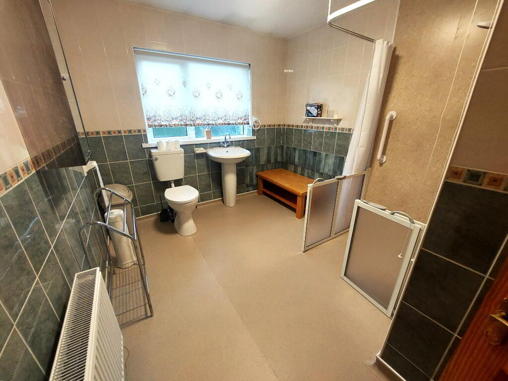 Tiled walls, vinyl flooring, WC, wash hand basin, walk in shower area with “AKW” electric shower unit, pvc cladding to the shower area, 1 radiator,1 window