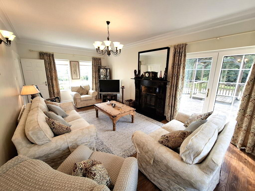 Laminate wooden flooring, ornate marble fireplace with multi fuel stove and granite hearth, 4 windows, 2 radiators, coving, French doors leading to decking, TV point, power points