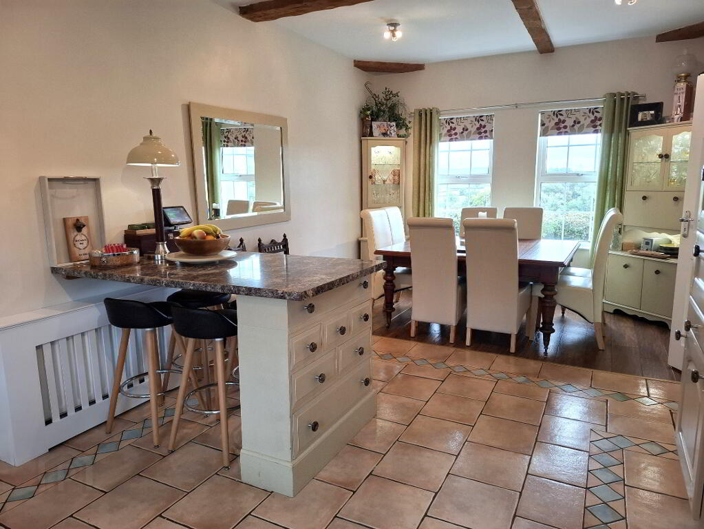 Tiled flooring to kitchen area, laminate flooring to dining area, range of eye level and base units with worktop space over, space for range with gas hob and electric ovens and grill, extractor fan over, tiled splashbacks, integrated dishwasher, integrated undercounter fridge, under cabinet lighting, sink unit with mixer tap, breakfast bar, 4 windows, 2 radiators, power points, door to: