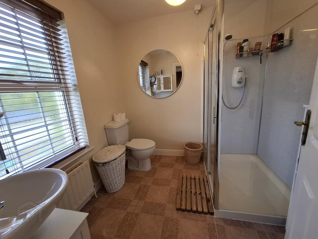 Tiled floor, WC, wash hand basin, pvc cladding to shower cubicle, Aqualisa electric shower unit, 1 window, 1 radiator, power points