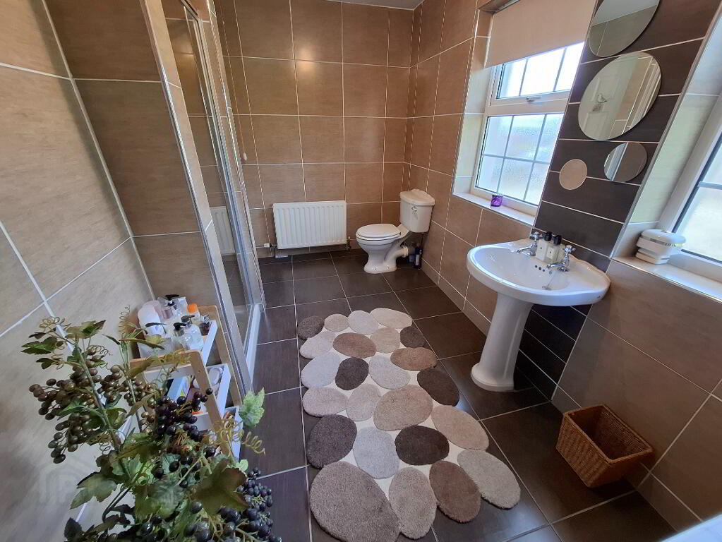 Tiled flooring, tiled walls, WC, wash hand basin, shower cubicle with Triton electric shower unit, 1 window, 1 radiator