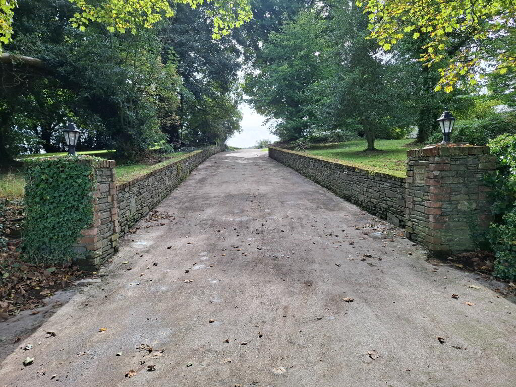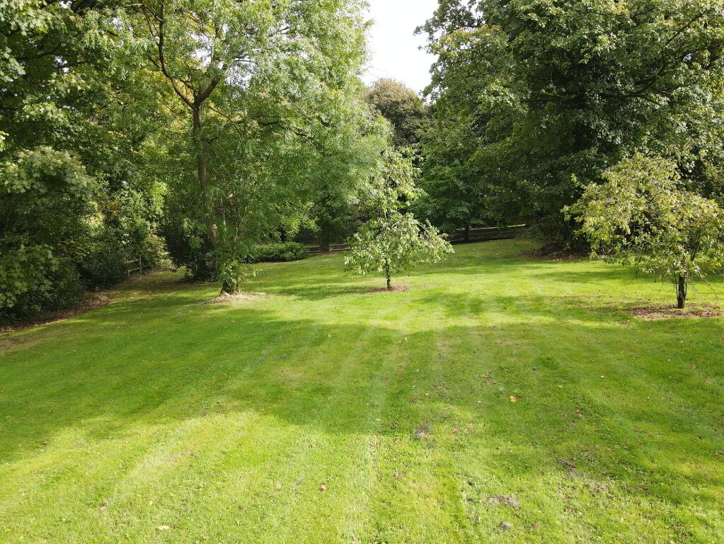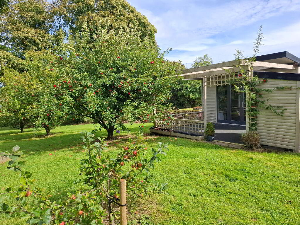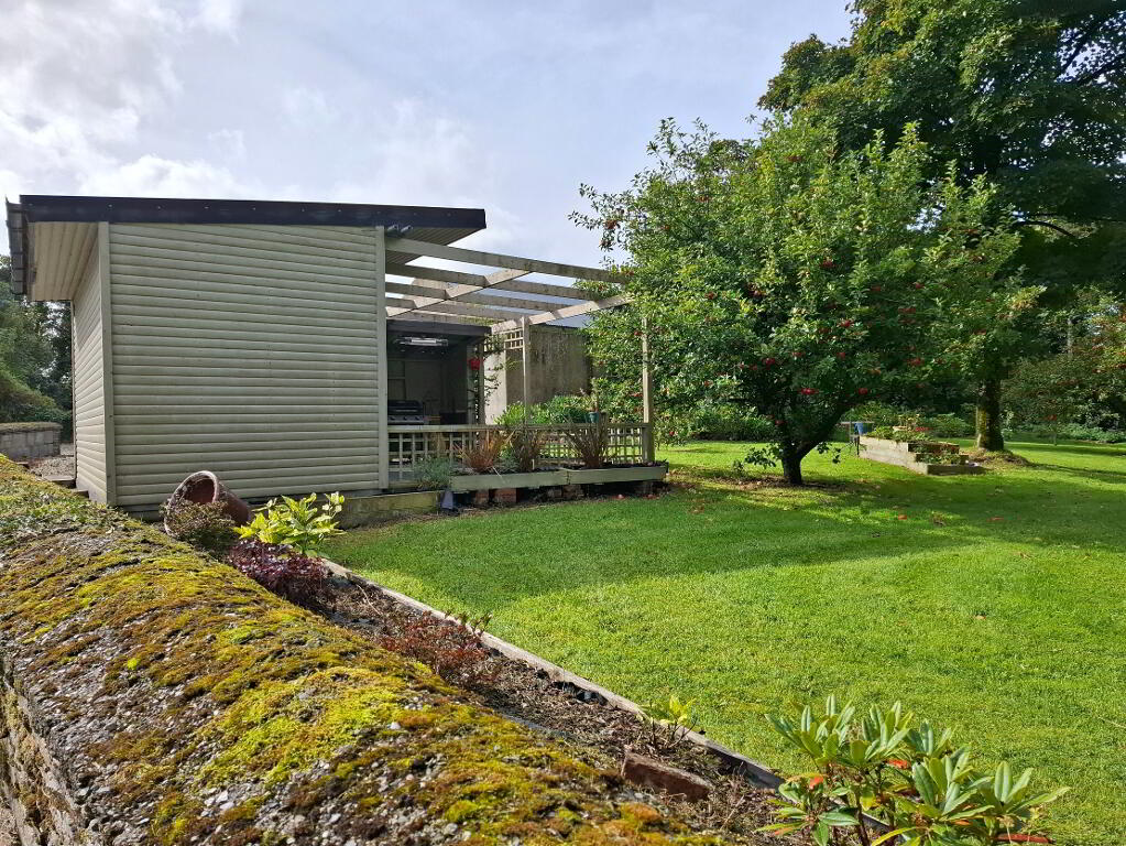 Private concrete driveway leading to part concreted, part gravelled yard, garden to front and sides, decked area, large orchard with various mature trees and bushes, summerhouse with BBQ area and decking, outside lights and power points, cameras and flood lighting