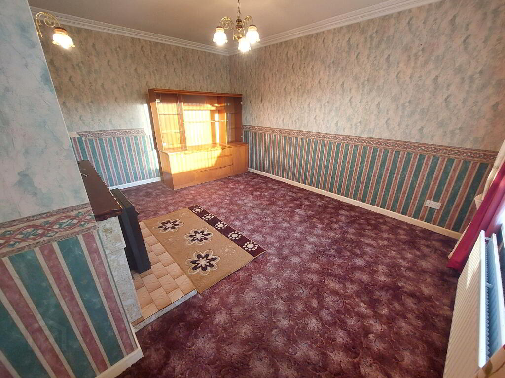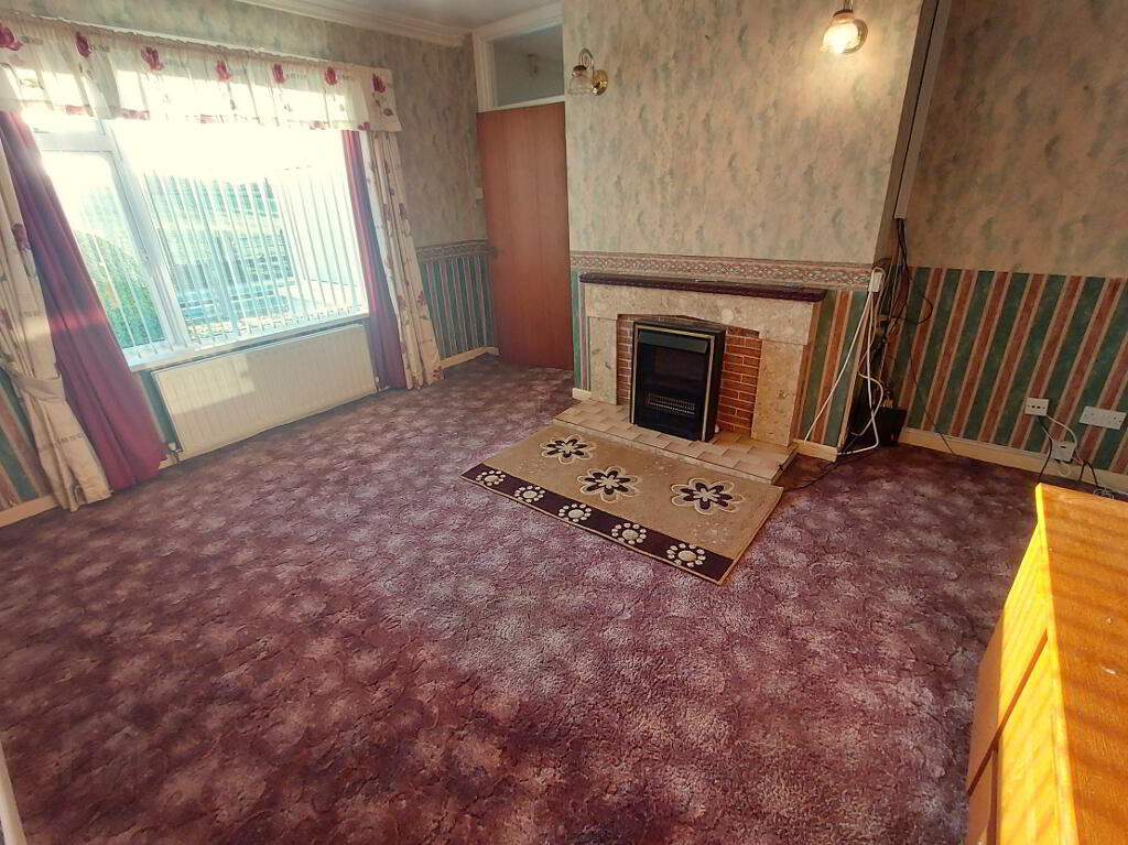 Carpeted, fireplace, coving and ceiling rose, 1 window with vertical blinds, 1 radiator, power points, TV point