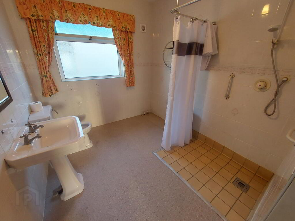 Vinyl floor, tiled walls, WC, wash hand basin, tiled wet area with shower, 1 window, 1 radiator
