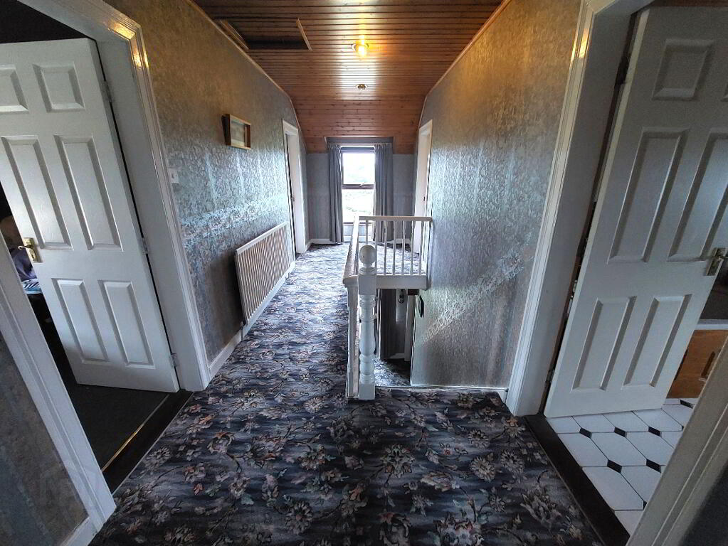 LANDING: Carpeted, pine panelled ceiling, 1 radiator, 1 window, roof space access, power points