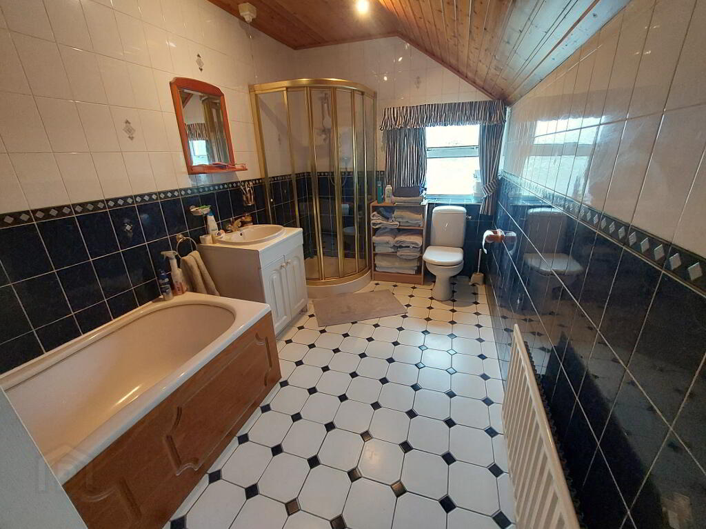 Tiled floor, tiled walls, pine panelled ceiling, WC, wash hand basin with vanity unit under, bath with mixer tap, shower cubicle with electric shower unit, 1 radiator, 1 window