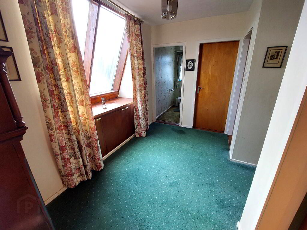 LANDING: Carpeted stairs and landing, storage off, 1 window, hotpress (shelved), roof space access, door to: