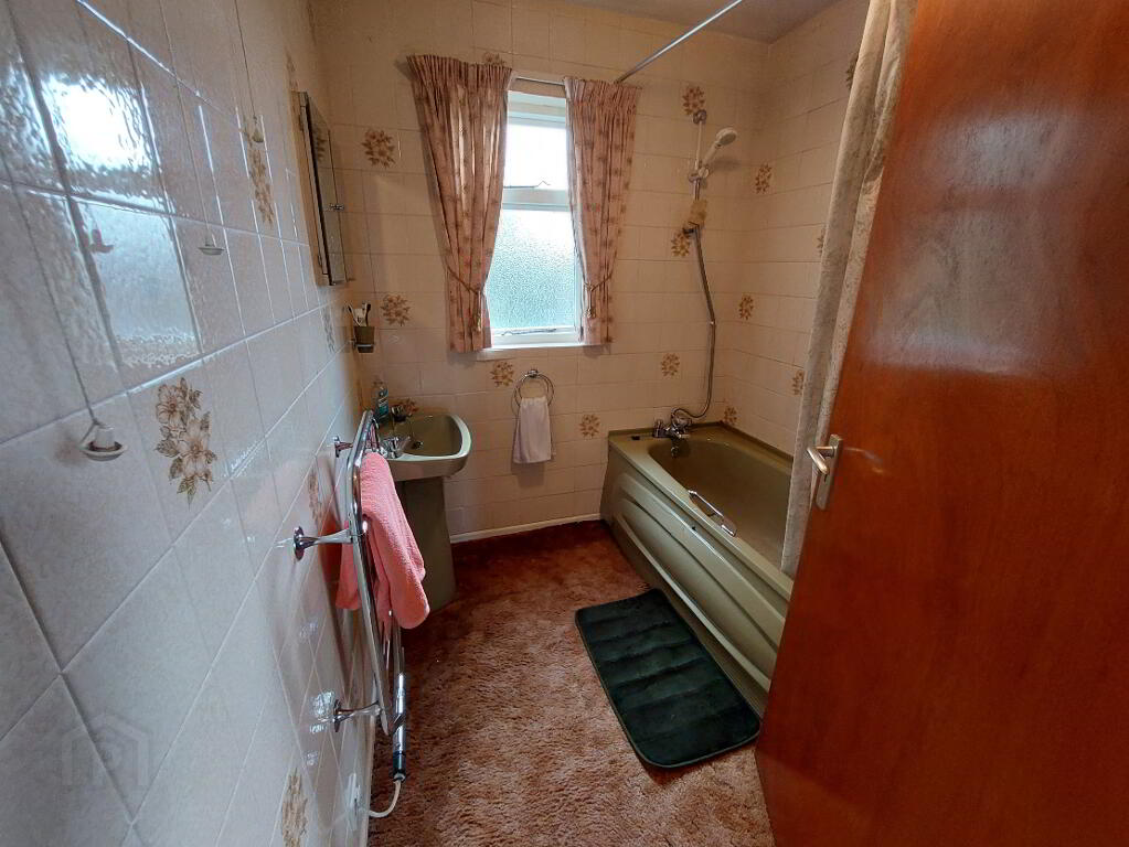 Carpeted, tiled walls, wash hand basin, bath, 1 window, 1 electric heater