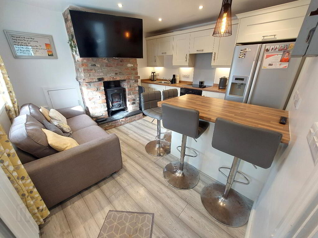 Laminate wooden floor, range of eye level and base units with ‘woodblock’ effect worktop over, integrated ceramic hob, integrated oven, extractor fan over, stainless steel sink, space for American style fridge freezer, breakfast bar with space for washing machine and dishwasher under, feature brick fireplace with stove, recessed downlighting, 1 window, 1 radiator, power points, door to: