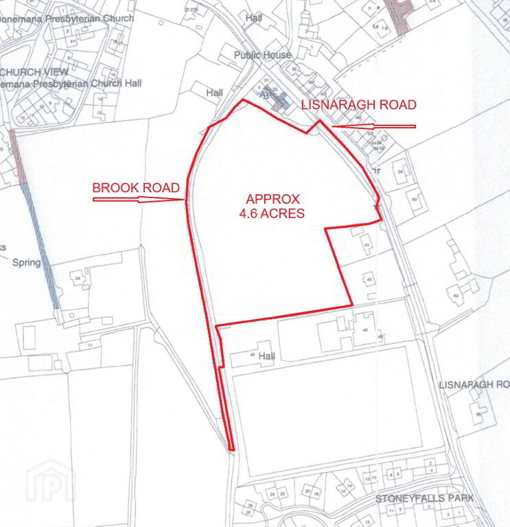 THE LAND:  Approximately 4.6 acres situated within the boundaries of Donemana village, fronting onto both the Brook Road and the Lisnaragh Road. Occupying a prominent location within the village, the land offers the purchaser prime development potential close to 2 already established residential developments, is adjacent to a primary school and playing field and within walking distance of the village’s amenities.  Donemana is conveniently located 13 miles from Derry / Londonderry and 8 miles from Strabane.