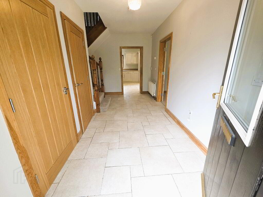 Tiled floor, cloakroom, under stair storage, carpeted stairway to landing, 1 radiator, telephone point, power points