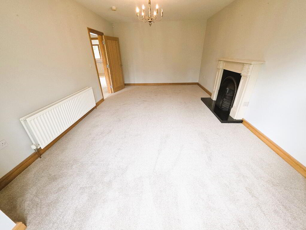 Carpeted, fireplace with marble surround and tiled hearth, 1 window with vertical blinds, 1 radiator, power points, tv point