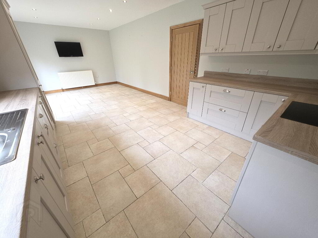 Tiled floor, extensive range of eye level and base units with worktop space over, stainless steel sink unit, tiled splashbacks, integrated hob and oven with stainless steel hood extractor fan over, integrated dishwasher, integrated fridge/freezer, recessed downlighting, 1 window, 1 radiator, tv points, power points, patio door to the rear garden