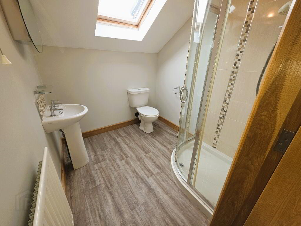 Vinyl floor, WC, wash hand basin, tiled shower cubicle, Velux window, 1 radiator