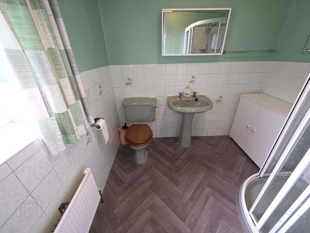 Vinyl floor, partly tiled walls, WC, wash hand basin, tiled shower cubicle area with Redring electric shower unit, 1 radiator, 1 window