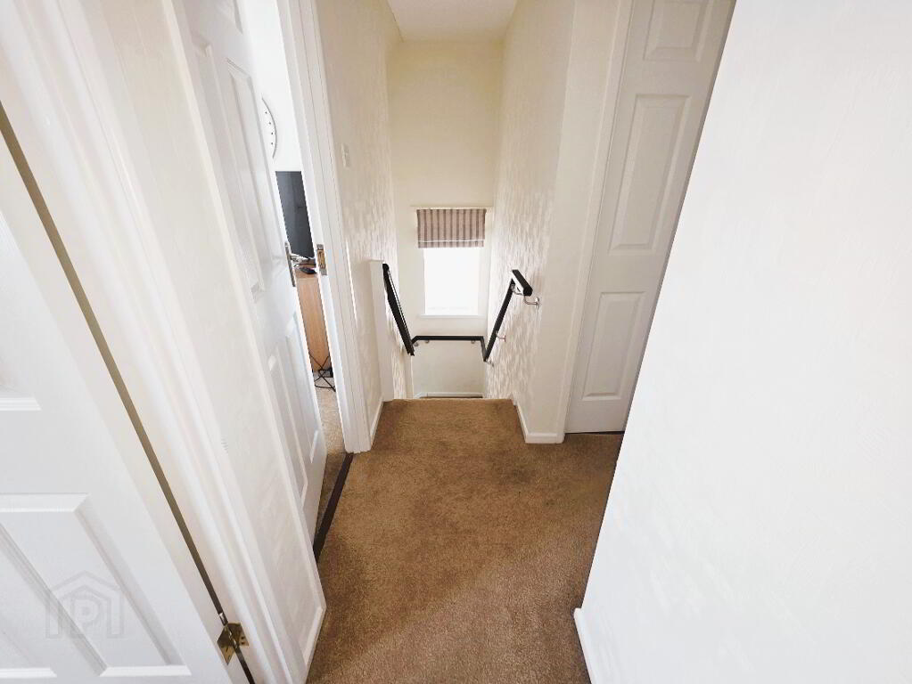 LANDING: Carpeted stairs and landing, 1 window with roman blind, roof space access, door to:
