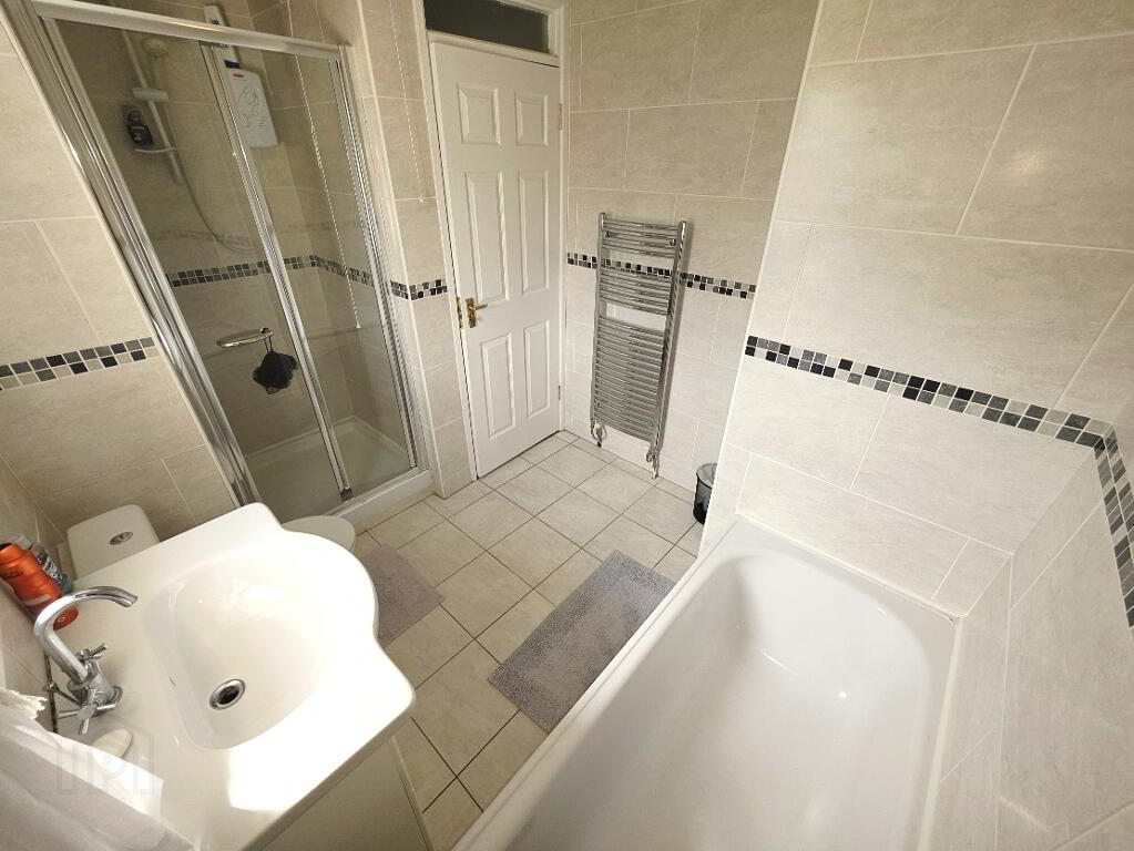 Tiled floor, tiled wall, pvc cladding to ceiling, WC, wash hand basin with vanity under, bath, tiled shower cubicle with electric shower unit (Redring), 1 window with vertical blinds, 1 radiator